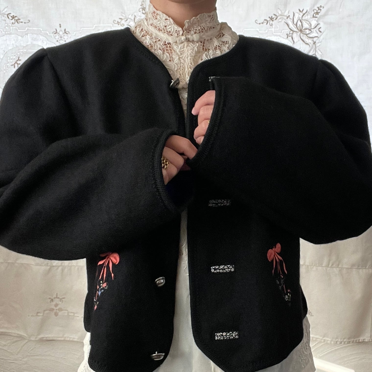 ピンクリボンの刺繍がなんともかわいい薄手のウールジャケットです。